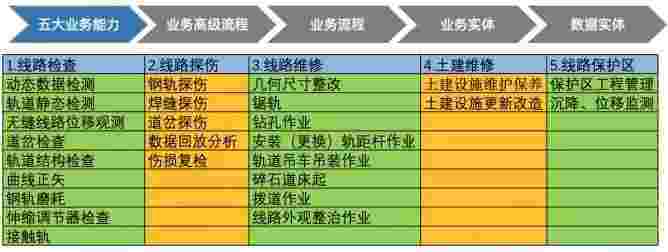 在轨道运维业务中,,,,,,,,,,,我们形成了完整的从业务能力(业务域)-业务流程-业务实体-数据模型的分析梳理过程。。。。。。。。。轨道运维业务能力如下图所示::::::::